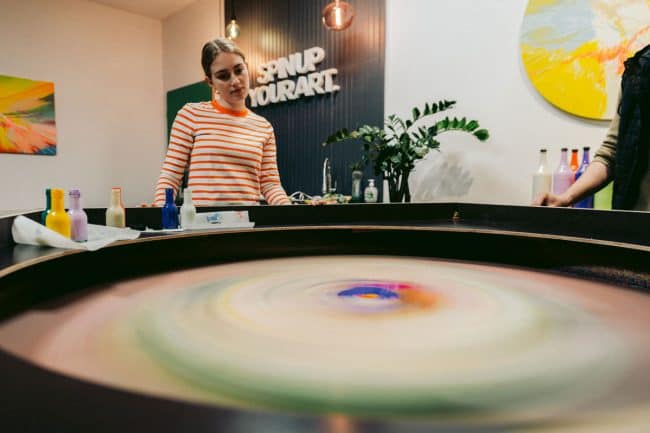 Spinpainting ist eine Kunsttechnik, bei der Farbe auf eine sich drehende Leinwand aufgetragen wird, wodurch einzigartige Muster und Designs entstehen.