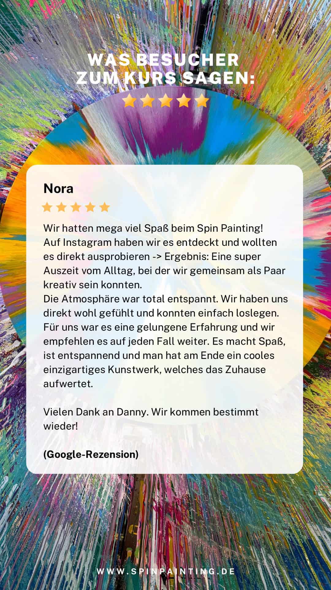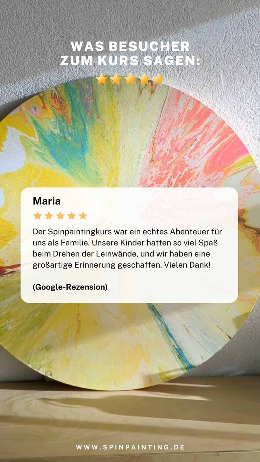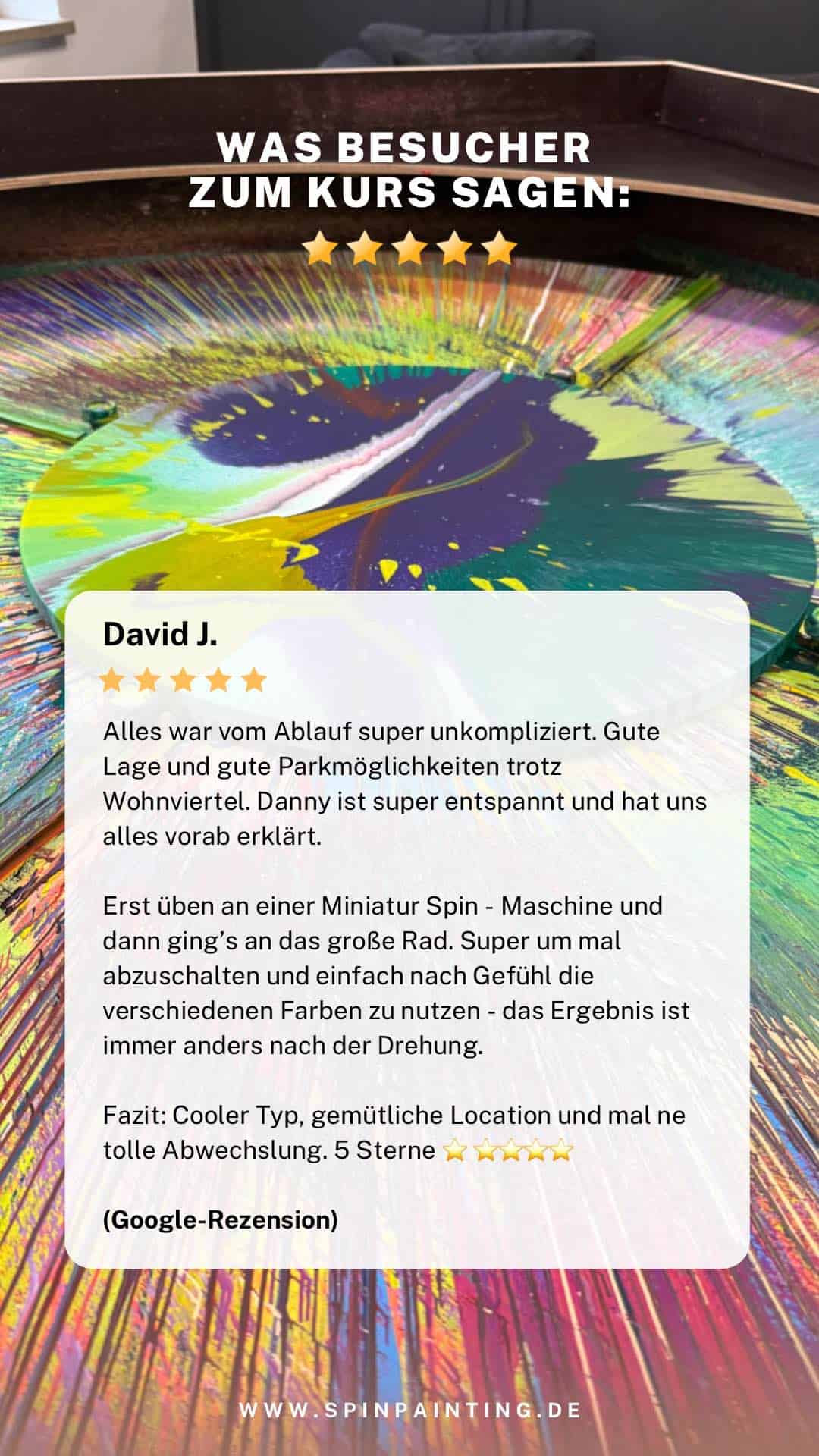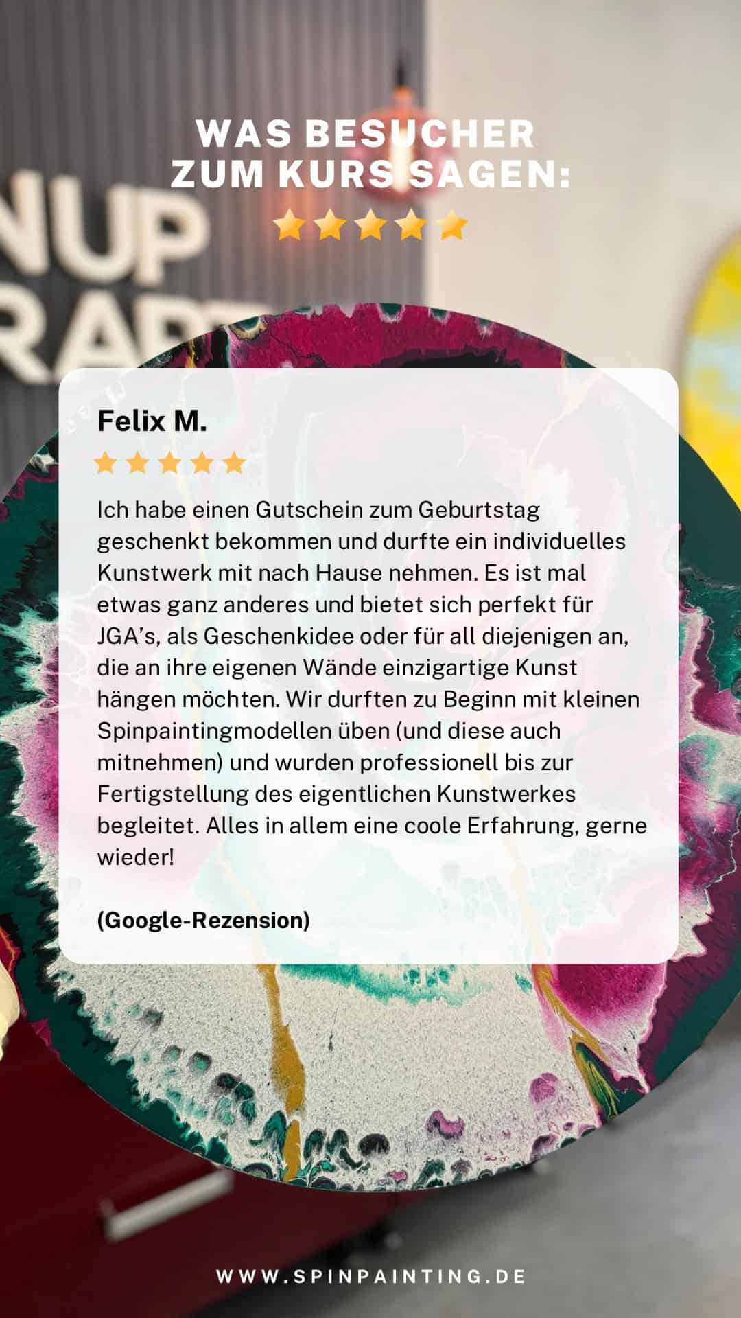 In diesem Kurs lernst du, wie du Acrylfarbe auf eine sich drehende Leinwand auftragen kannst, um einzigartige Kunstwerke zu erschaffen. Wir führen dich Schritt für Schritt durch die neue Technik und geben dir wertvolle Tipps. Wir bieten ein unterhaltsames und inspirierendes Umfeld, in dem du deine Kreativität ausleben kannst.
